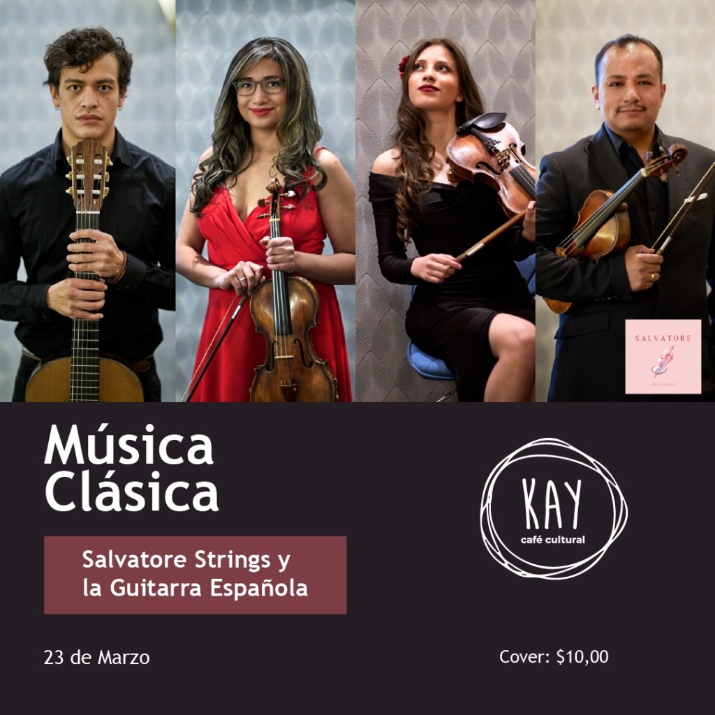 La cita es este jueves 23 de marzo a las 20h00 en Kay Café Cultural. Disfruta de una velada acogedora y muy artística con la compañía de Cuarteto Salvatore, con la participación especial de nuestro guitarrista Álvaro Durango. Tendremos un magnífico repertorio de Música Antigua que la podrás disfrutar junto a vinos y una deliciosa comida que ofrece Kay Café Cultural.